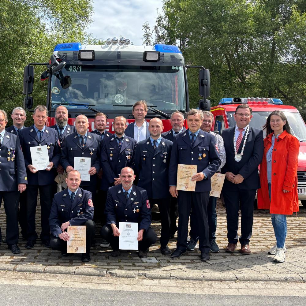 Im Rahmen des diesjährigen Feuerwehrfestes der Freiwilligen Feuerwehr Unterleinleiter wurden am Samstag, den 29. Mai 2025, langjährige Feuerwehrkameraden für ihren aktiven Dienst geehrt. Die Auszeichnungen wurden von Landrat Dr. Hermann Ulm persönlich übergeben. Für 40 Jahre aktiven Dienst erhielten Thomas Preller (FFW Unterleinleiter) und Georg Wiemann (FFW Neuses-Poxstall) das Feuerwehr-Ehrenzeichen in Gold.